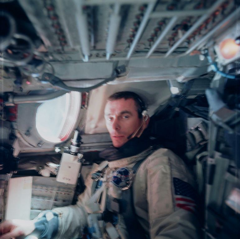 An exhausted Gene Cernan can barely manage a grimace for Tom Stafford's camera after completing his spacewalk on Gemini IX-A. Had the hands of fate played out a little differently, this seat might instead have been occupied by Charlie Bassett. Photo Credit: NASA